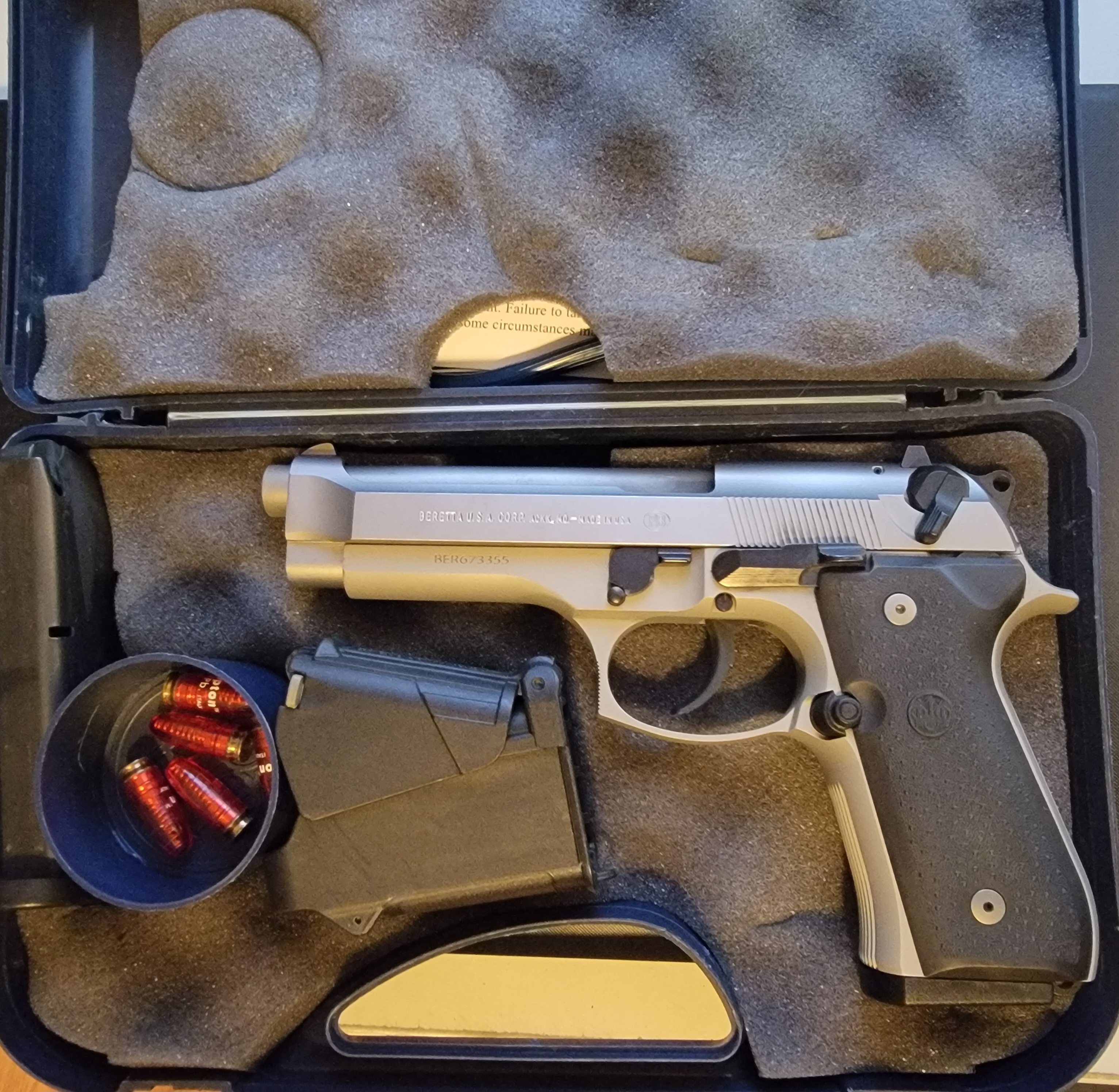 Beretta 92FS Semi Auto Pistol. Chambered in 9mm Luger. Inox finish. Includes two 15 round magazines. Original box and paperwork. We are even throwing in an Uplula mag loader as well as some Tipton snap caps. Excellent gun and beautiful condition!